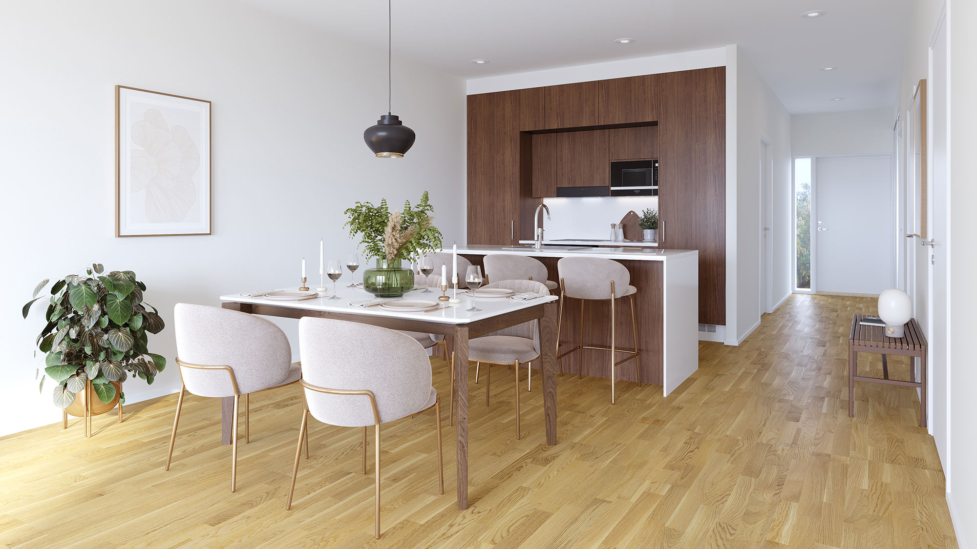 KAARNA-sisustusteemassa syvän ruskea keittiö raikastuu valkoisella tasolla, minkä lisäksi tila saa seurakseen vaalean tammiparketin. Pähkinän sävyinen keittiö luo kotiin ylellisen vaikutelman, mutta samalla sen luonnonläheisyys tuo kodikkuutta ja lämpöä.